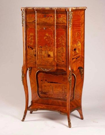 The present piece displays a masterful example of true fine figural marquetry in scale to the expanse of the cabinet.